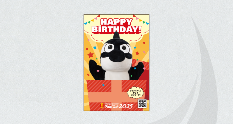お誕生月にグランパスくんからのお祝いメッセージ動画にアクセスできるURLがついたバースデーカード(ハガキ)をお届けします。