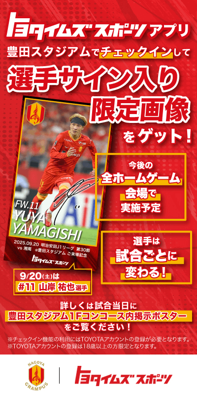 トヨタアスリートのすべてをお届けする「トヨタイムズスポーツ」公式アプリで、ホームゲーム開催日当日、豊田スタジアムで「チェックイン」をすると、当日だけの「選手サイン入り限定画像」をプレゼントいたします!