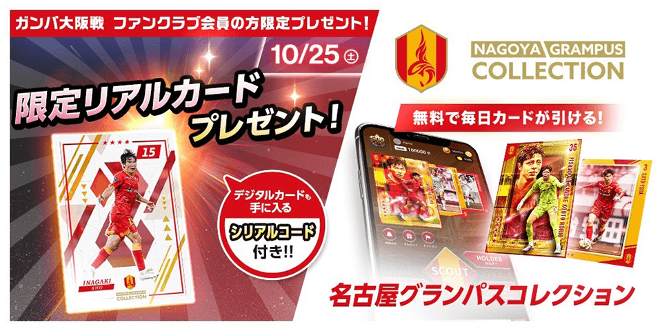 10/25(土)ガンバ大阪戦のファンクラブ来場プレゼントブースにて、「名古屋グランパスコレクション限定リアルカード」を先着10,000名様にプレゼントいたします。
