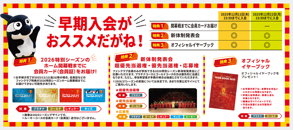 ※2026特別シーズンのホーム開幕戦までに会員証のお届けを希望される方は2025年12月11日(木)23:59までに入会(入金)が必要となります。