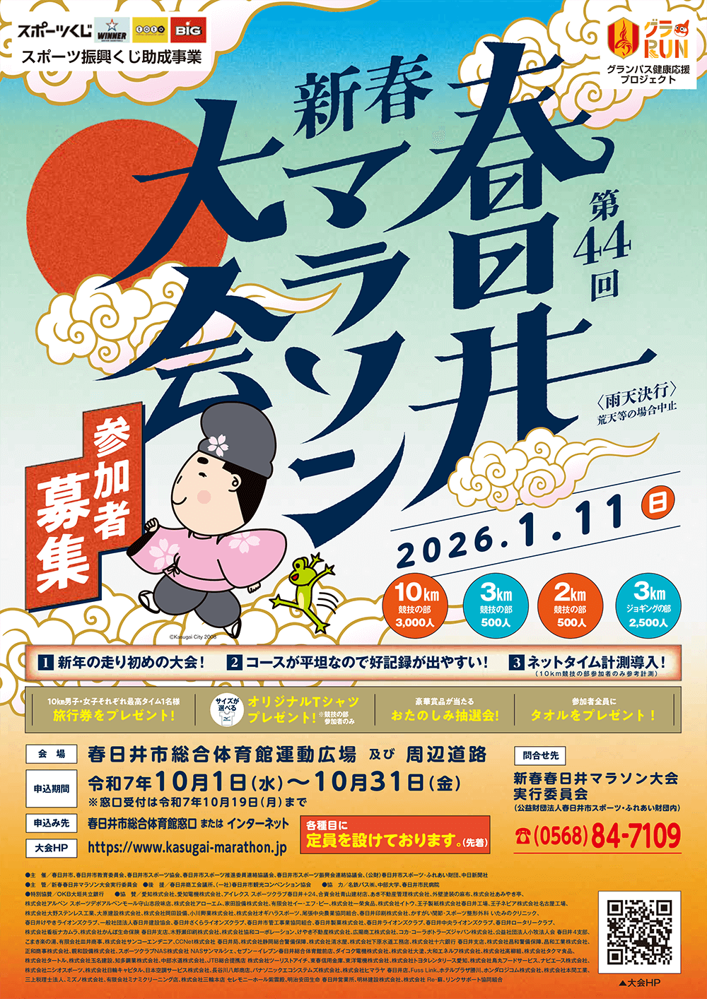 名古屋グランパスはグランパスファミリーの皆さまや地域の皆さまと一緒に走りながら繋がりを深め、"グランパスファミリーの輪"を広げていくプロジェクト『グラRUN』の一環として、令和8年1月11日(日)に開催される「第44回新春春日井マラソン大会」 と連携することが決定しました。