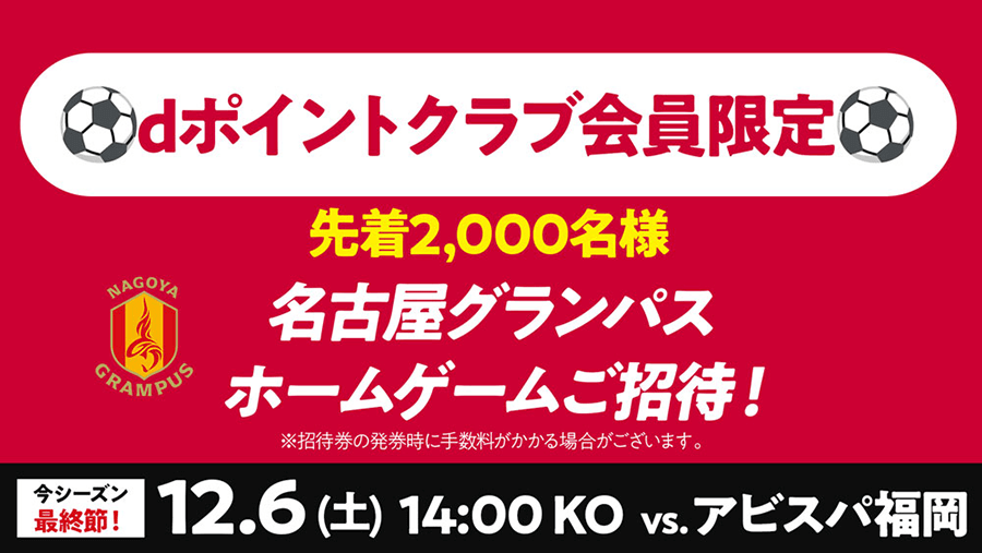 名古屋グランパスでは、12月6日(土)アビスパ福岡戦にて、「dポイントクラブ会員」の方を対象に観戦企画を実施することとなりましたのでお知らせいたします。