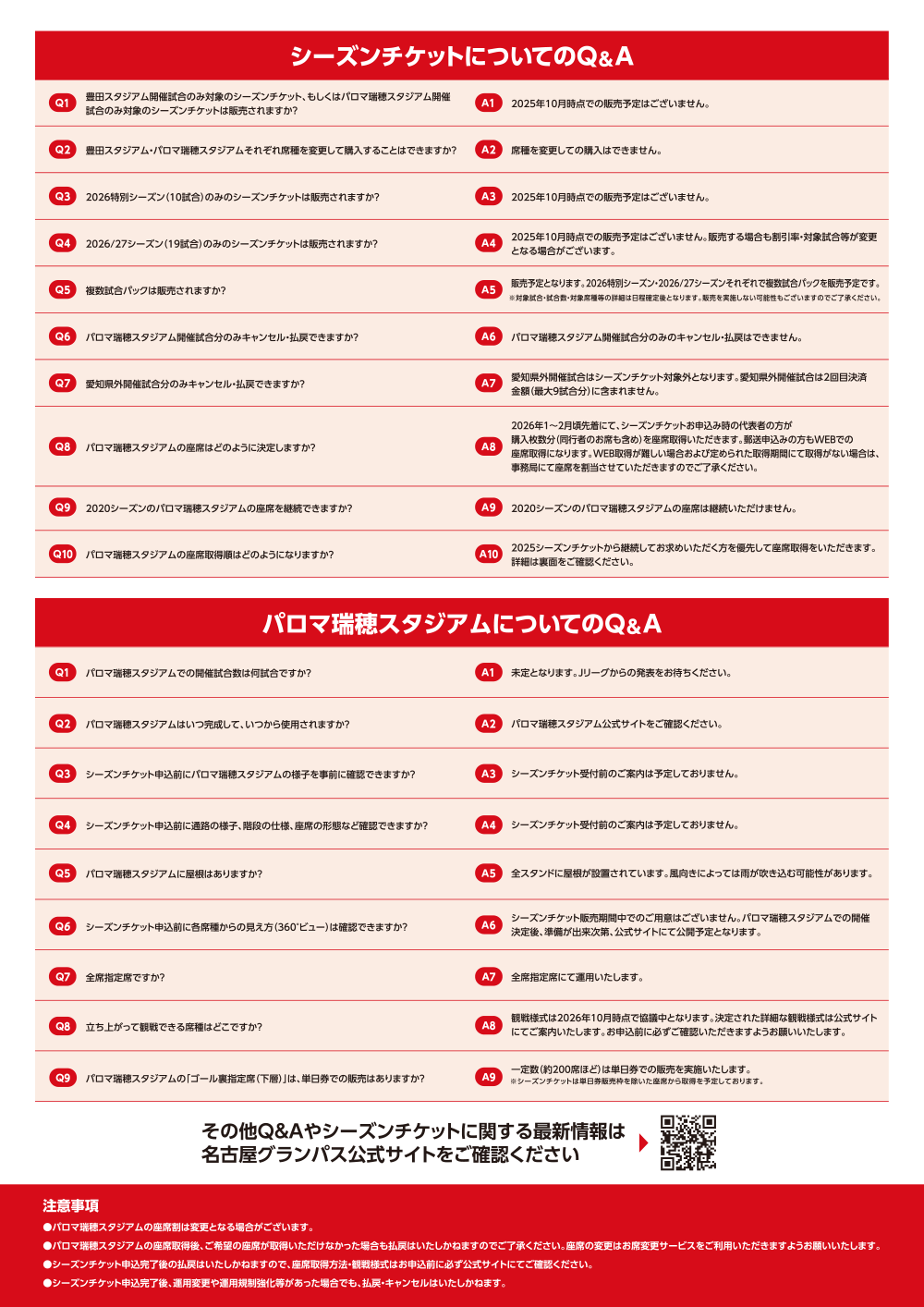 Q.1 豊田スタジアム開催試合のみ対象のシーズンチケット、もしくはパロマ瑞穂スタジアム開催試合のみ対象のシーズンチケットは販売されますか?