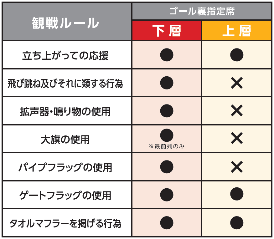 「立ち上がっての応援可能エリア」となります。但し、「飛び跳ね及びそれに類する行為」は禁止となります。手拍子や、足を地面につけた上で身体を動かす等の動作については、制限されておりません。また、「ゴール裏指定席(上層)」は下層エリアと異なり、以下の行為が認められておりませんので、予めご了承ください。