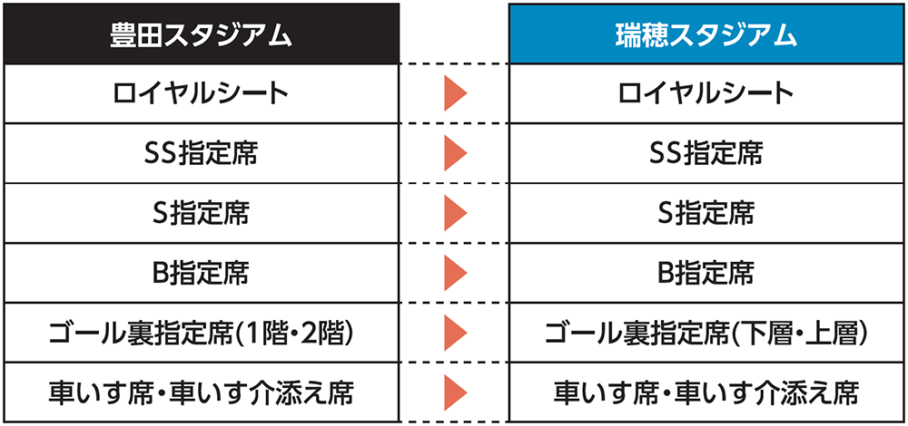 但し、豊田スタジアム「A指定席」または「メイン3階指定席」をご購入いただく方は、パロマ瑞穂スタジアムの設置席種の都合上、豊田スタジアムとパロマ瑞穂スタジアムでご購入いただく席種が異なる場合がございます。詳細は下部をご確認ください。