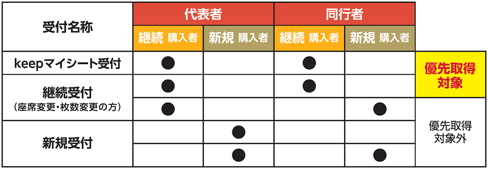※代表者が2025シーズンチケットを購入されていた方(継続購入の方)の場合でも、2025シーズンチケットを購入されていない方(新規購入の方)を同行者に登録いただく場合は「優先取得」の対象外となります。
