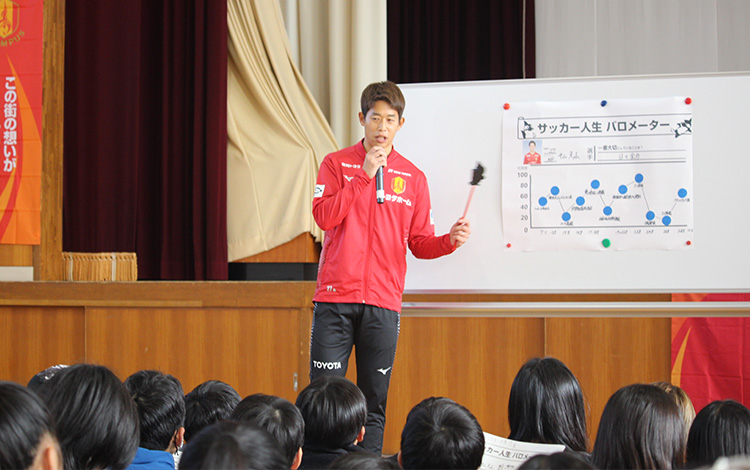 プロサッカー選手は順風満帆に今の姿があるわけではありません。夢を描き挑戦をしながら、失敗や挫折を乗り越えて今があります。挑戦することの重要性、挫折をどのように乗り越えたか、選手が直接子ども達にメッセージを伝える活動をしていきます。また選手だけではなく、コーチ、OB、スタッフなどの経験やキャリアを伝えながら、将来を考えるきっかけづくりを行います。