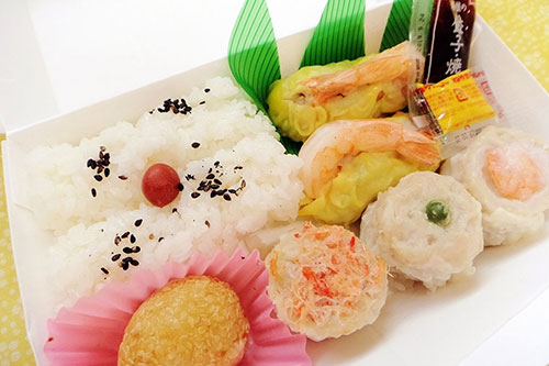 特注の黄色の皮に大きな海老を包んで「金シャチ」に見たてた蒸し餃子が入っていて、海老がダイレクトに味わえます。 ちゃんせいろで蒸した「蟹焼売」「肉焼売」「海老焼売」や「胡麻団子」も入った本格的な点心弁当です。