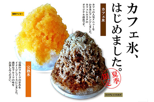 有機栽培のコーヒーを始め、この時期は種類が豊富なかき氷(カフェ氷)がお薦め!