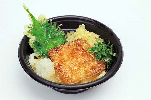さっぽりとしたシソの風味に仕上げたお餅が入った油揚げと大葉をトッピング。