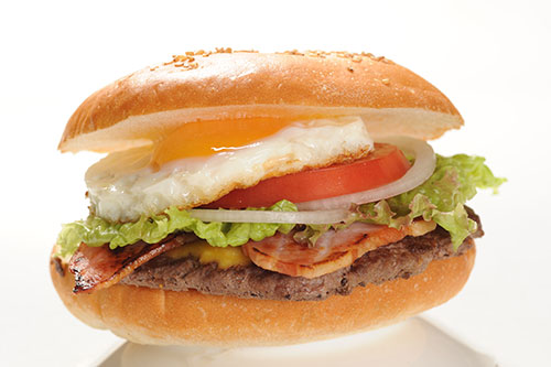 バンズ、パティ、チーズ、ベーコン、たまご、トマト、レタス、オニオン・・・もうボリューム満点です!